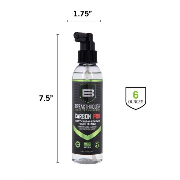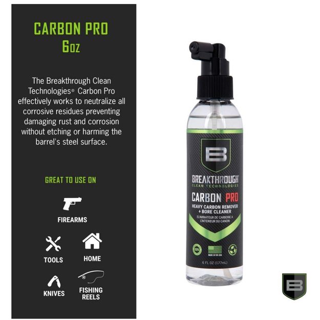 The Breakthrough Clean Heavy Carbon Remover is a water-based cleaner that removes heavy carbon and lead deposits from your firearm. Utilizing a proprietary blend of chemical surfactants and detergents, our degreaser effectively neutralizes all corrosive residues, especially on the gun's barrel and bore. It prevents damaging rust and corrosion without etching or harming the barrel’s steel surface. Primarily used to clean and maintain firearms, this carbon remover also works on cars, aircrafts, boats, and motorcycles.