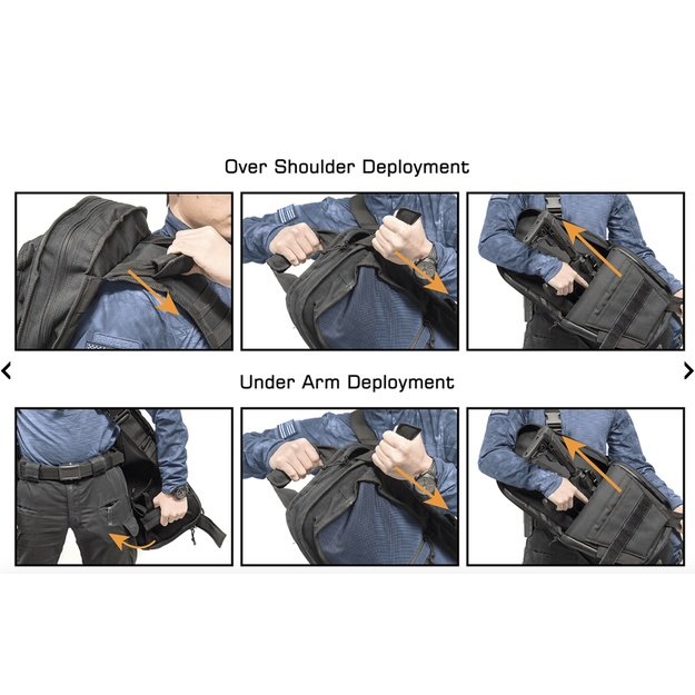 Priekinė viršutinė kišenė su lipnia juostele, skirta pritvirtinti pridedamą dvikryptį pistoletų dėklą